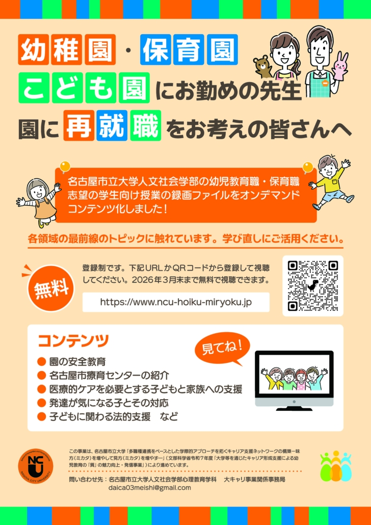 園にお勤めの先生や復職を考えている方向けに、名古屋市立大学人文社会学部における子どもや教育・保育に関わる講演のオンデマンド視聴サイトお知らせチラシを作成しました。